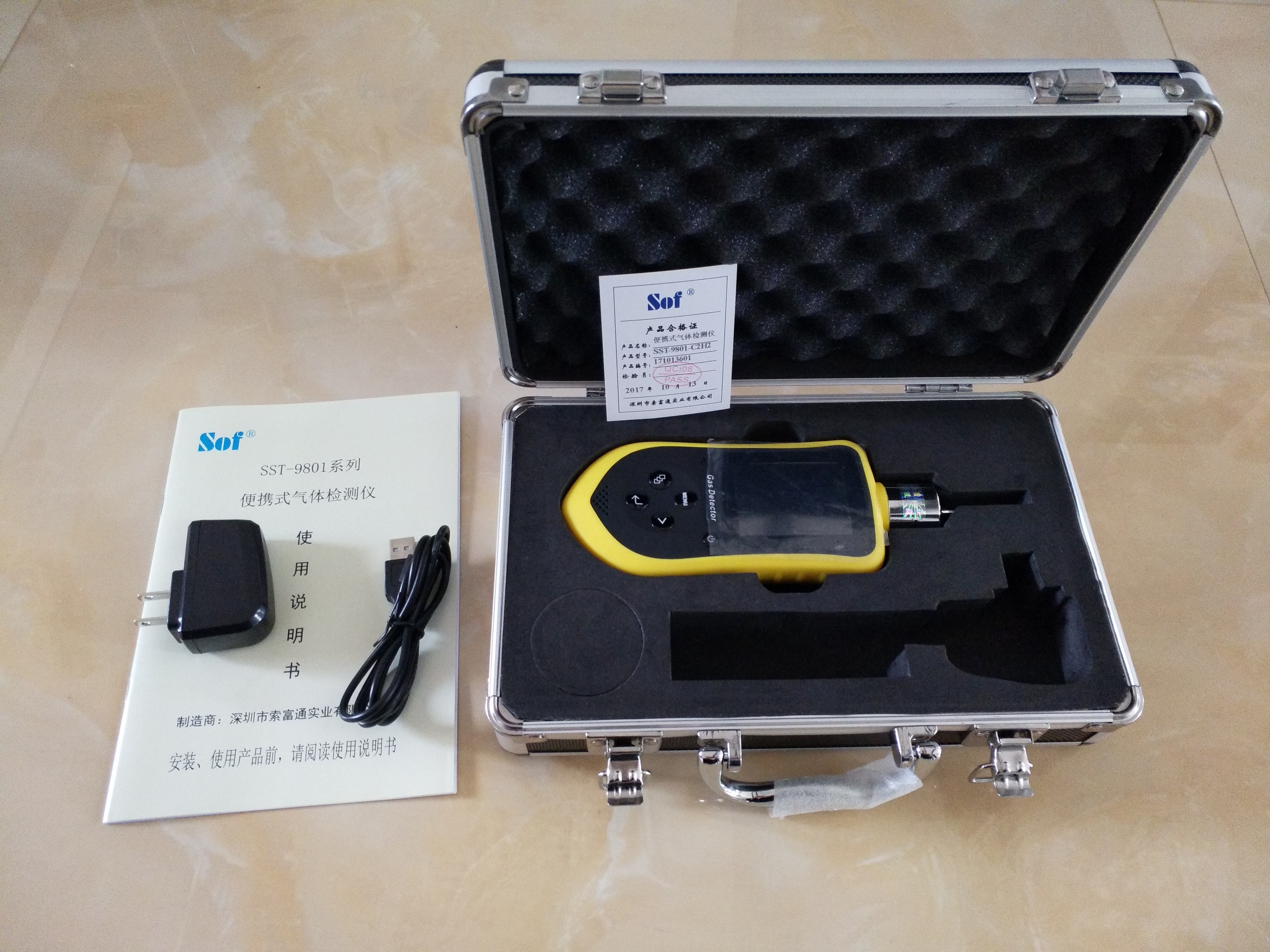 - SST- 9801系列氣體檢測儀是索富通實業(yè)有限公司于2017年推出的一款智能型便攜泵吸式氣體檢測儀;是全球首款搭載智能光感控制、集氣體、溫度、濕度、時間、吸氣泵、報警為一體的多功能氣體檢測報警裝置;客戶只需一鍵開機,無需任何化學試劑,即可實時對空氣中的被測氣體濃度進行檢測;當現(xiàn)場被測氣體濃度達到預設的報警點時,會自動發(fā)出聲光報警,并有溫馨文字提示;產(chǎn)品采用當前最先進的氣體檢測傳感技術,可快速出檢測結果。SST-9801系列氣體檢測儀具有設計前衛(wèi)、操作簡便、測量精準、堅固耐用的特點;警示“黃”配以磨砂“黑”色調,沉穩(wěn)醒目;人體學“十字型”按鍵設計,操控方便;2.4英寸超高清液晶彩色屏幕,美觀大方;高強度 ABS+ PC塑膠外殼,耐沖擊、耐酸、耐堿、耐寒、耐熱、易阻燃;32位納米級微處理器搭配16位超高ADC采集芯片,計算速度更快、數(shù)值更精確;本安型電路設計、安全可靠;內置世界著名吸氣泵品牌-德國THOMAS 微型真空泵,提供穩(wěn)定、持久氣流;國外原裝進口氣體傳感器,精度高、穩(wěn)定性強、誤差率低、直線性好;2800mA大容量鋰電池,為氣體檢測提供持久續(xù)航;PPM 與mg / m3檢測單位自由切換,簡單明了;中英文操作界面,適用所有人群;還可選配數(shù)據(jù)存儲功能,輕松存100,000條數(shù)據(jù)。支持本機查看;并可通過電腦將數(shù)據(jù)導出,進行打印、編輯、圖表顯示等。